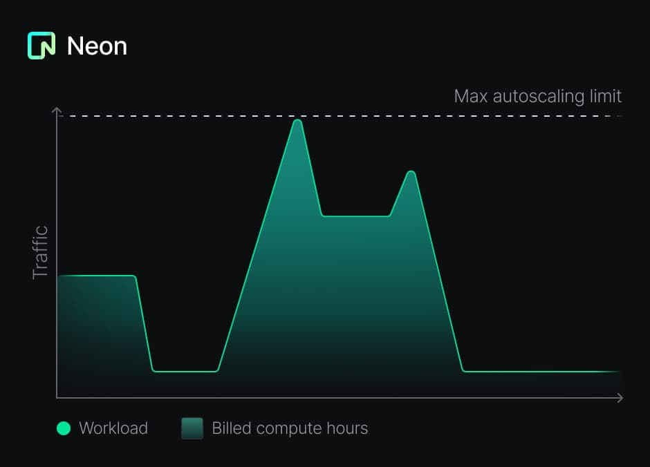 - Neon autoscales according to traffic, dynamically adjusting CPU and memory as needed.